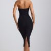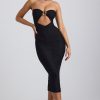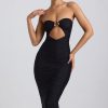 Classic silhouettes with an inventive twist. Rendered in two staple hues, the Bryanna midaxi dress is cut from our premium 20D mesh fabric and fully ruched to create a cinched, contoured look. The strapless silhouette is spliced with a graphic cut-out at the front and the sweetheart neck is secured with striking custom-developed metal hardware.