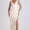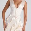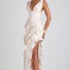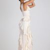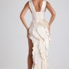 RSVPs await. A design that’s sure to turn heads, the Ambrosia dress is crafted from sumptuous matte satin with a touch of stretch. Cut to a maxi length with a plunging V-neckline and boned corset bodice, the fitted column silhouette is enlivened with diagonal ruffle trims and a thigh-high split that creates a dynamic sense of movement.