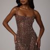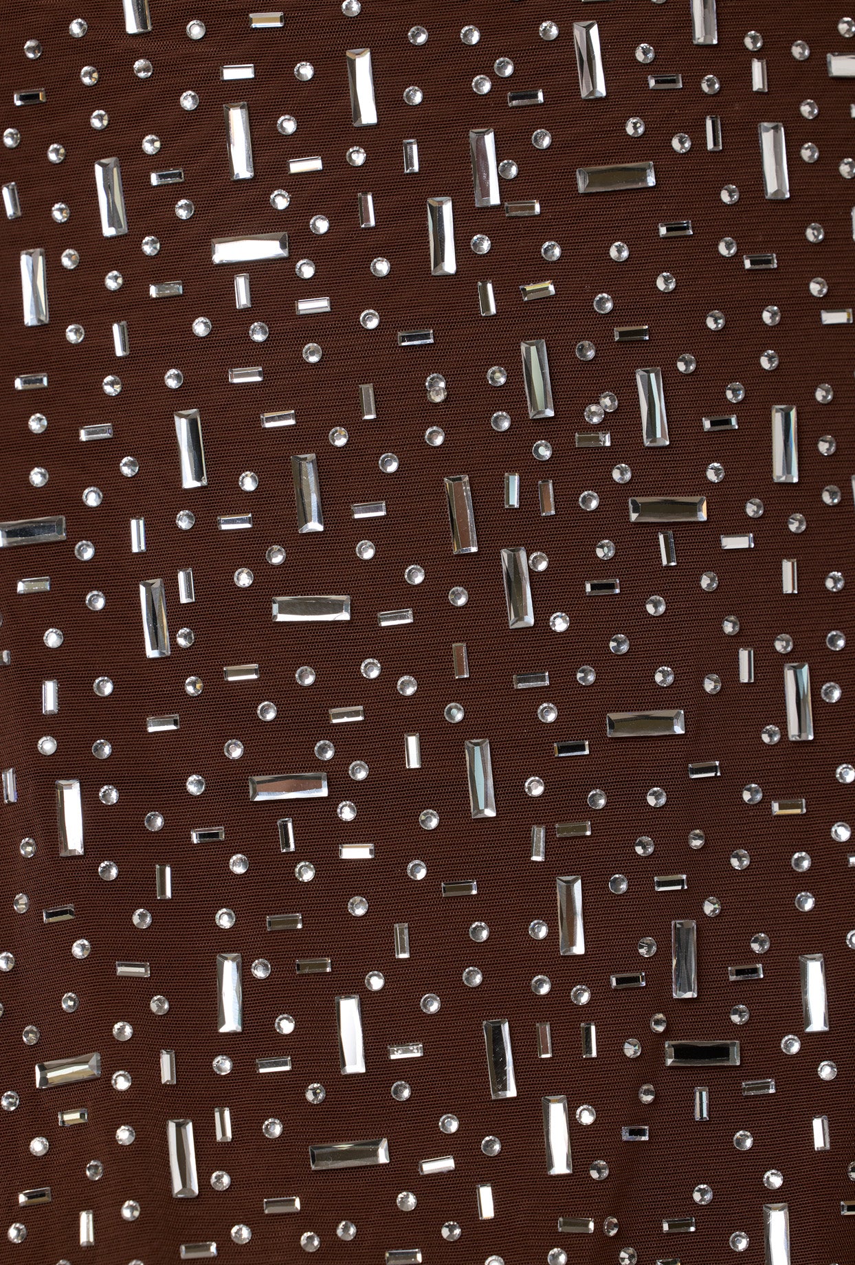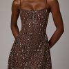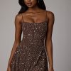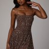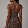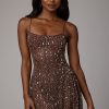 Sheer Embellished Scoop Neck Mini Dress in Deep Cocoa