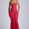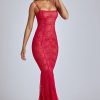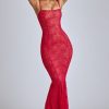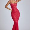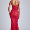 Sheer Lace Fishtail Gown in Cherry Red