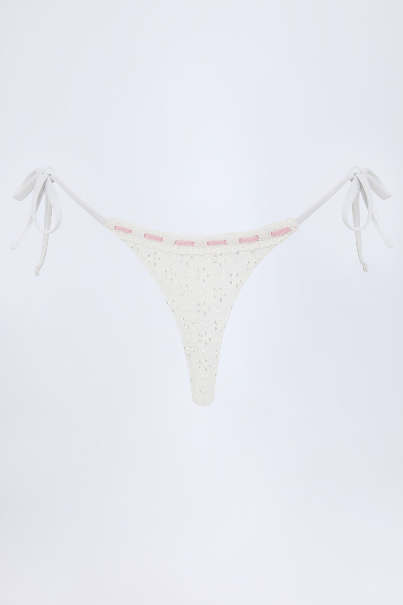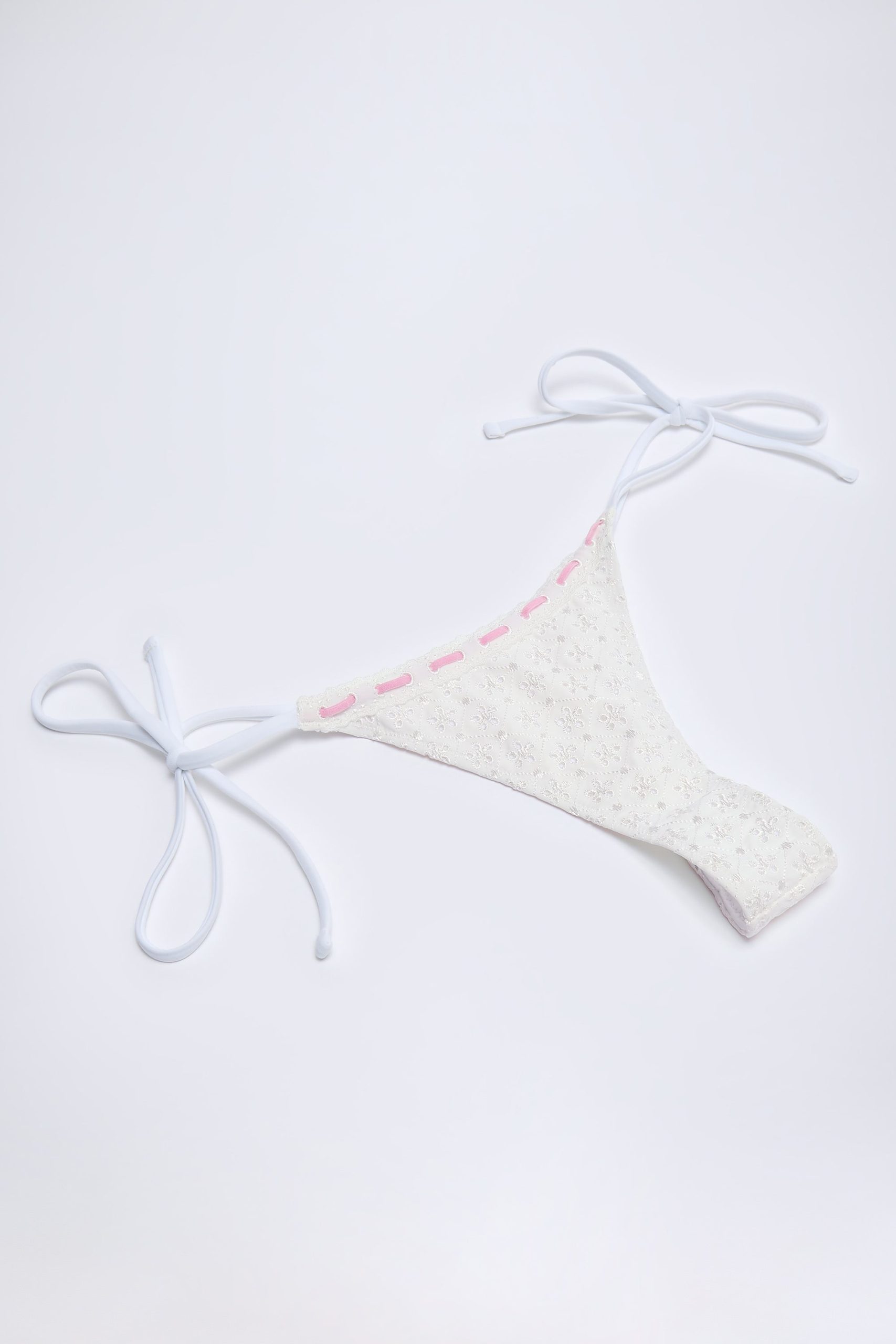 A sweet style for sun-soaked days by the dock, the Vernazza bikini bottoms are crafted from premium broderie anglaise swim fabric with a touch of stretch. Cut to a low-rise silhouette with high-cut legs, they’re traced with pretty stretch-ribbon detailing and offer thong coverage at the back. The ties at each side can be adjusted for your perfect fit.
