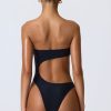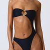Master resort dressing. The perfect one-piece for beach club or beach days that turn into balmy evenings, this bandeau swimsuit is crafted from premium stretch-jersey swim fabric that sculpts and shapes your figure. It’s punctuated with a curved side cut-out and small bust cut-out, anchored with signature gold-tone shell hardware for a statement finish.