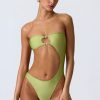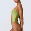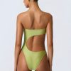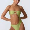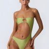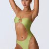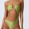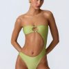 Master resort dressing. The perfect one-piece for beach club or beach days that turn into balmy evenings, this bandeau swimsuit is crafted from premium stretch-jersey swim fabric that sculpts and shapes your figure. It’s punctuated with a curved side cut-out and small bust cut-out, anchored with signature gold-tone shell hardware for a statement finish.