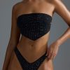 Swimwear that doubles as playful styling pieces. Ideal for navigating poolside days that turn into endless balmy evenings, this bandeau bikini top is crafted from soft-touch stretch-jersey swim fabric to an asymmetric scarf-inspired silhouette. It’s embellished with sparkling hotfix rhinestones and features adjustable ties at the back for a comfortable, custom fit.
